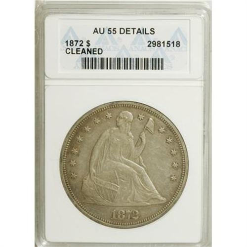 <B>1872 $1 --Cleaned--ANACS. AU55 Details.</B></I> NGC Census: (22/127). PCGS Population (36/108). Mintage: 1,106,450. Numismedia Wsl. Price for NGC/PCGS coin in AU55: $675. (#6968)<BR><BR><b>Shipping:</b> Coins & Currency (<a target="_blank" href="http://www.heritageauctions.com/common/shipping.php">view shipping information</a>)