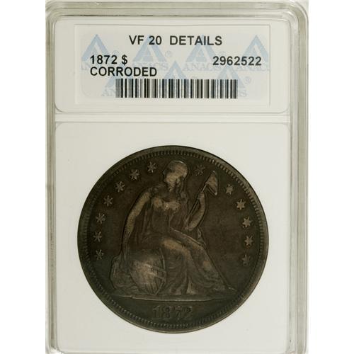 <B>1872 $1 --Corroded--ANACS. VF20 Details.</B></I> NGC Census: (19/277). PCGS Population (5/323). Mintage: 1,106,450. Numismedia Wsl. Price: $267. (#6968)<BR><BR><b>Shipping:</b> Coins & Currency (<a target="_blank" href="http://www.heritageauctions.com/common/shipping.php">view shipping information</a>)