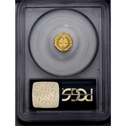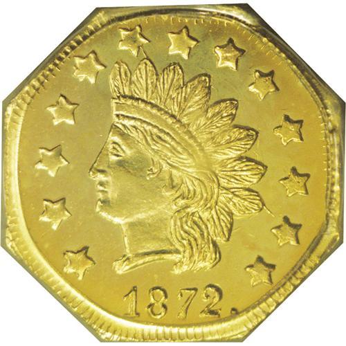 <B>1872<$1> Indian Octagonal 1 Dollar, BG-1119, High R.5, MS63 PCGS.</B></I> The strike is impressively sharp, since any softness is relegated to portions of the lower left wreath. Flashy sunrise-gold fields display faint green-gray tints when tilted opposite to the light. A cud is affixed to the L in GOLD, as usual for the variety.
