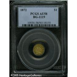 <B>1872 $1 Indian Octagonal 1 Dollar, BG-1119, High R.5, AU58 PCGS.</B></I> A modestly circulated green-gold example with remnants of prooflike luster surrounding the devices. Desirable high denomination issue. Lot:9820