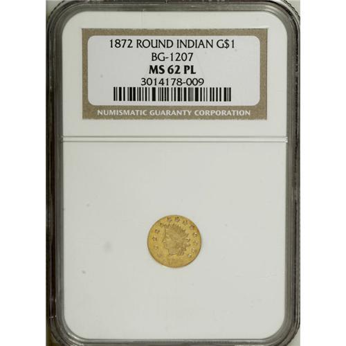<B>1872 $1 Indian Round 1 Dollar, BG-1207, R.4, MS62 Prooflike NGC.</B></I> Each side of this moderately reflective gold dollar displays significant reflectivity in spite of haze and scattered marks. Boldly impressed and modestly contrasting devices rise from the yellow-orange fields. An attractive example. Census: 2 in 62 Prooflike, 1 finer (12/06).<BR><BR><b>Shipping:</b> Coin/Currency (<a target="_blank" href="http://www.heritageauctions.com/common/shipping.php">view shipping information</a>)