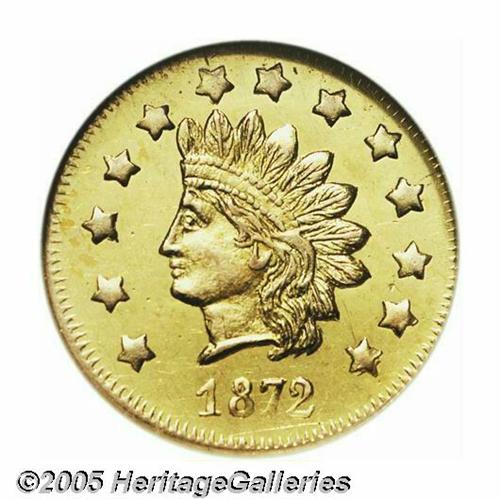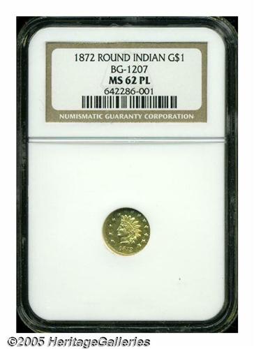 <B>1872<$1> Indian Round 1 Dollar, BG-1207, R.4, MS62 Prooflike NGC.</B></I> A deeply prooflike specimen with a bright, yellow-gold finish and a relative good strike for this often soft issue. A few small marks and hairlines on the surfaces tend to limit the grade. Scarcer issue.