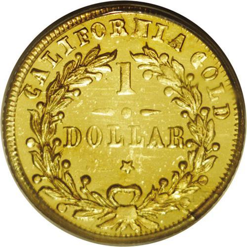 <B>1872<$1> Indian Round 1 Dollar, BG-1207, R.4, MS64 PCGS.</B></I> This prooflike older holder near-Gem has flashy straw-gold fields and an unabraded appearance. The obverse is well struck, although the reverse has areas of softer definition. A few thin retained laminations (as made) are noted near the borders. This obverse die was later paired with a TOKEN reverse (BG-1208).