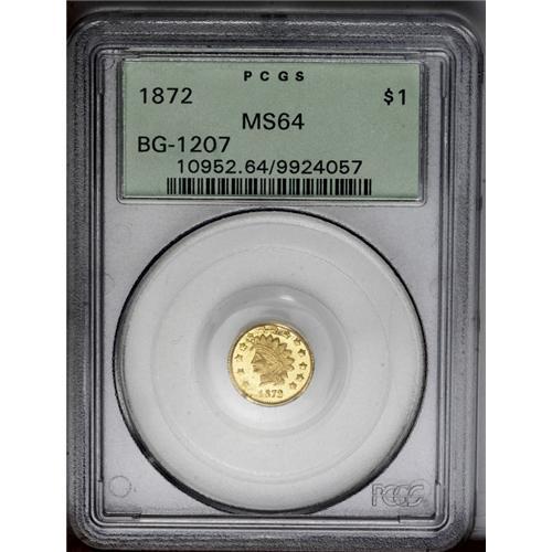 1872 $1 Indian Round 1 Dollar, BG-1207, R.4, MS64 PCGS 1872