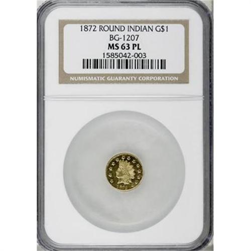 <B>1872 $1 Indian Round 1 Dollar, BG-1207, R.4, MS63 Prooflike NGC</B></I>. The penultimate Period Two variety, from the same obverse die as the famous BG-1208 token variety. Sharply struck except for the 87 in the date. Minor marks near the final obverse star and the reverse center dot are appropriate for the grade. Struck with close to a medal turn.<BR><BR><b>Shipping:</b> Coins & Currency (<a target="_blank" href="http://www.heritageauctions.com/common/shipping.php">view shipping information</a>)