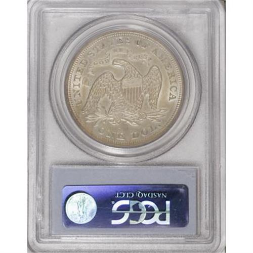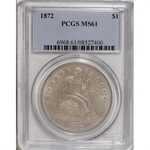 <B>1872 $1 MS61 PCGS.</B></I> Softly lustrous beneath subtle pearl-gray and gold patina. The reverse is well struck, although the right-side stars have incomplete centrils. The obverse field displays a few inconspicuous hairlines.<BR><BR><B>Coin Engraver:</B> Christian Gobrecht<BR><BR><b>Shipping:</b> Coins & Currency (<a target="_blank" href="http://www.heritageauctions.com/common/shipping.php">view shipping information</a>)