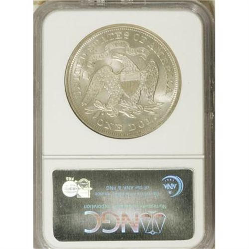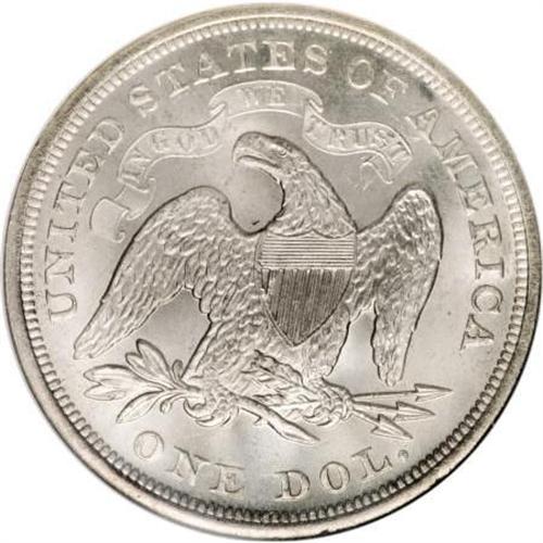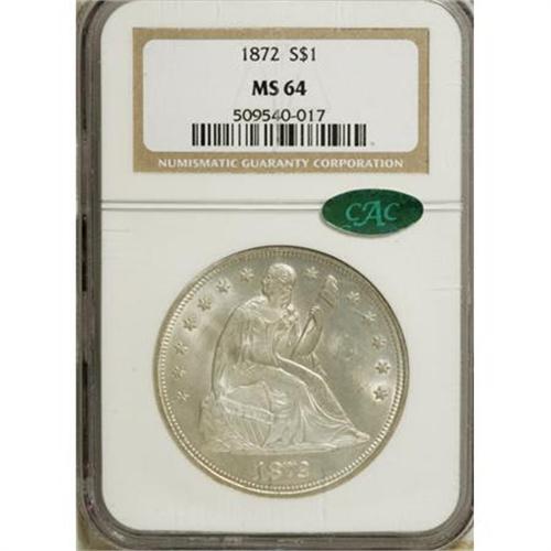<B>1872 $1 MS64 NGC. CAC.</B></I> The 1872 was coined in larger quantities than any other issue of the design (more than 1.1 million pieces). Yet, examples in the higher levels of Mint State are elusive. Lustrous, champagne-silver color adorns both sides of this near-Gem, and a well-executed strike imparts strong definition to the design elements. A few minuscule marks and luster grazes preclude Gem status. Census: 21 in 64, 3 finer (2/08).<BR><I>From The Queller Family Collection of Silver Dollars.</B></I><BR><BR><B>Coin Engraver:</B> Christian Gobrecht<BR><BR><b>Shipping:</b> Coins & Currency (<a target="_blank" href="http://www.heritageauctions.com/common/shipping.php">view shipping information</a>)