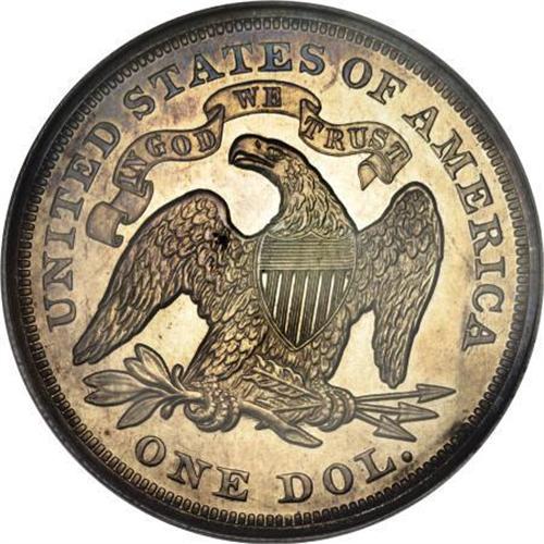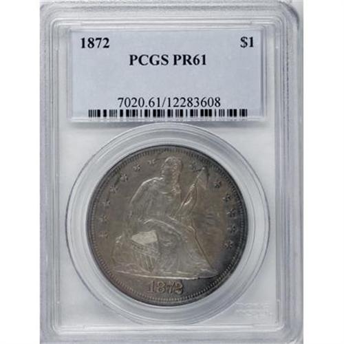 <B>1872 $1 PR61 PCGS.</B></I> 1872 is notable within the Proof Seated dollar series as a year when the coins received high quality strikes. This coin is no exception to this rule and features antique gold surfaces within gunmetal blue peripheries to go along with the full detail. The reverse retains a high degree of reflectivity, while the obverse has faded a bit over time. Light contact marks, visible under magnification, account for the grade.<BR><BR><B>Coin Engraver:</B> Christian Gobrecht<BR><BR><b>Shipping:</b> Coins & Currency (<a target="_blank" href="http://www.heritageauctions.com/common/shipping.php">view shipping information</a>)