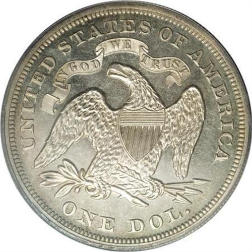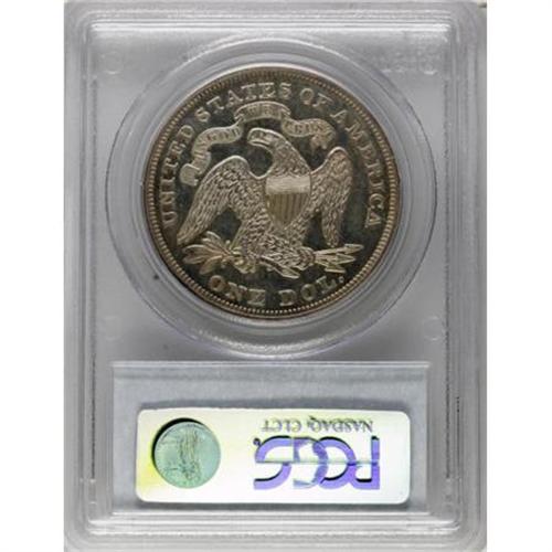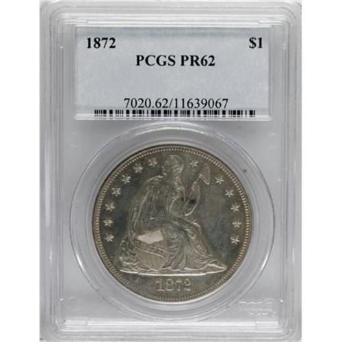 <B>1872 $1 PR62 PCGS.</B></I> Of the 950-piece mintage of 1872 proof Seated Liberty dollars, David Bowers (1993) says: " ... some Proofs probably remained unsold (from their inclusion in minor and silver Proof sets) at the end of the year and were melted in 1873." Whisper of light tan-gold color rest upon this PR62 specimen. Some field-motif contrast is noted, and all of the design features are exquisitely struck. Some inoffensive hairlines limit the grade.<BR><BR><b>Shipping:</b> Coins & Currency (<a target="_blank" href="http://www.heritageauctions.com/common/shipping.php">view shipping information</a>)