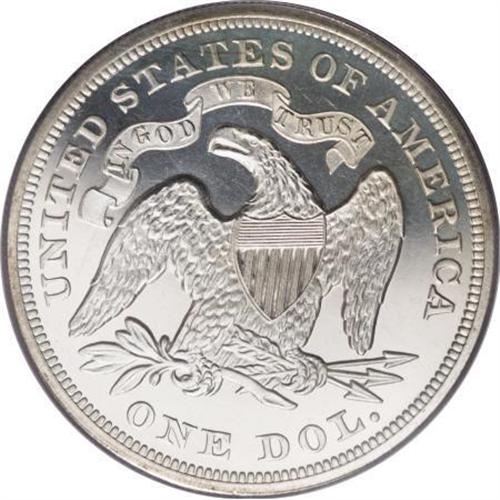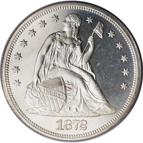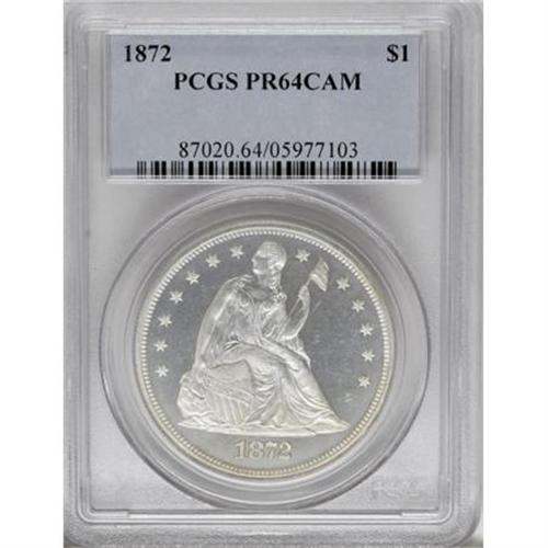<B>1872 $1 PR64 Cameo PCGS.</B></I> Thick mint frost covers the devices on each side, and the brilliant silver-white surfaces show just a glint of a golden cast. A sharply struck piece with few mentionable impairments, whose grade is determined by a few light hairlines and contact marks visible only with a loupe. While other pieces may grade numerically higher, this coin is at the high end of the aesthetic vs. grade scale.<BR><BR><b>Shipping:</b> Coins & Currency (<a target="_blank" href="http://www.heritageauctions.com/common/shipping.php">view shipping information</a>)