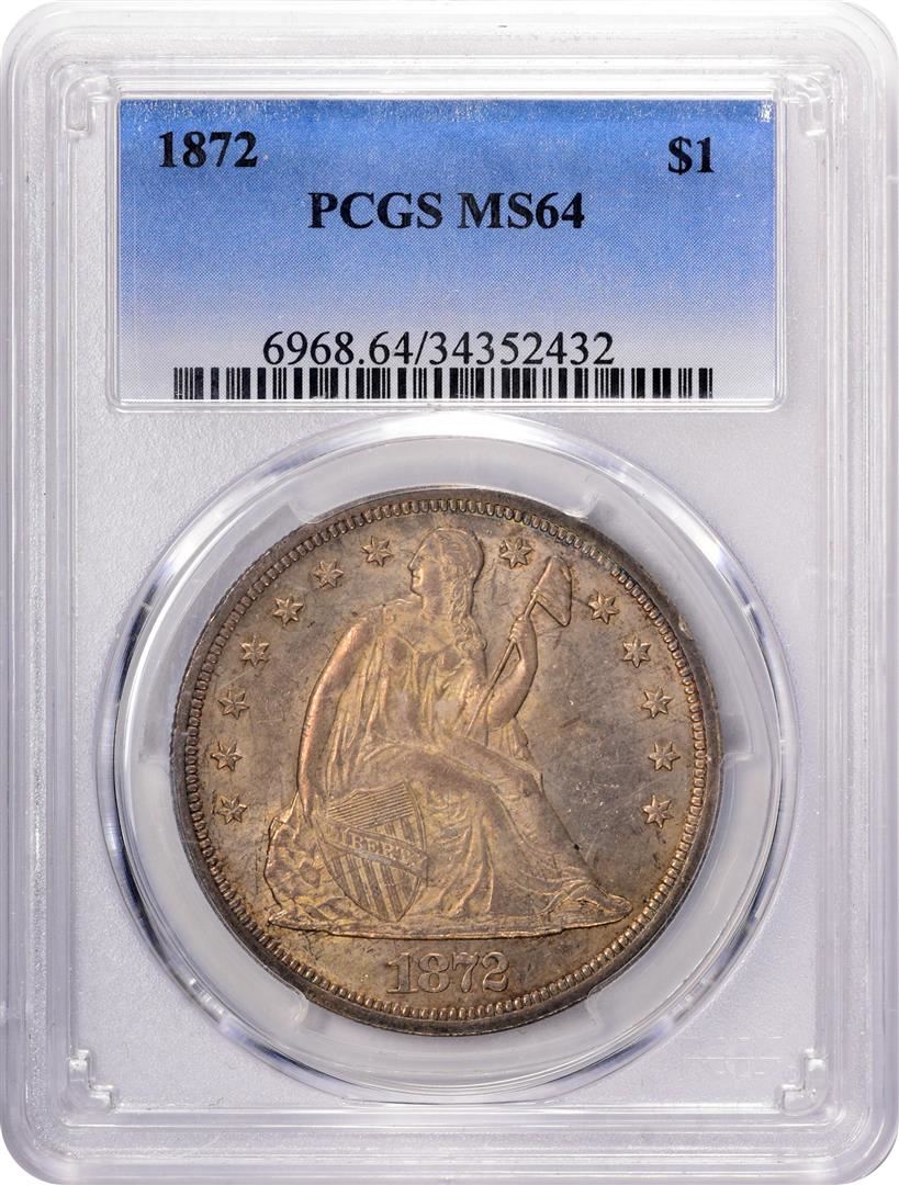 One 1872 $1 Seated Liberty Silver Dollar Coin PCGS MS64. PCGS Graded.