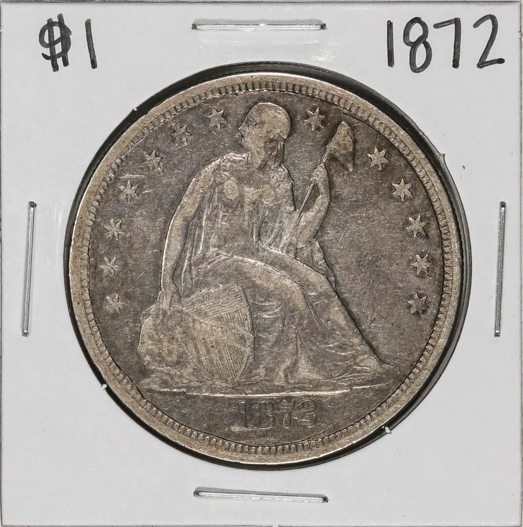 One 1872 $1 Seated Liberty Silver Dollar Coin.