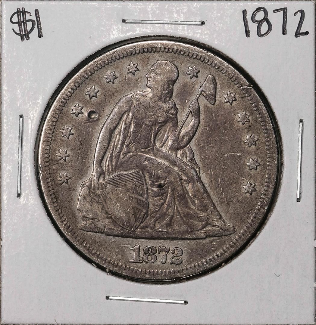 One 1872 $1 Seated Liberty Silver Dollar Coin.