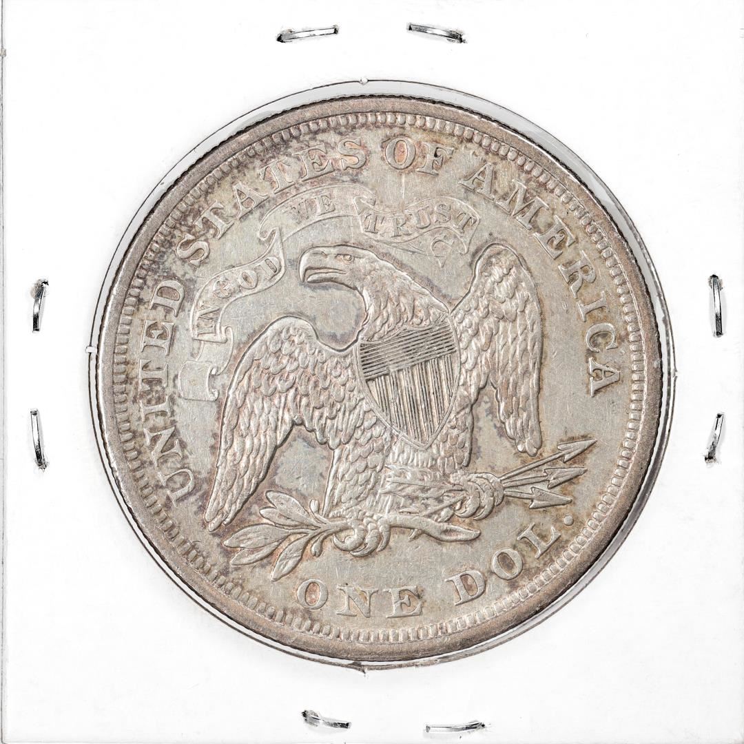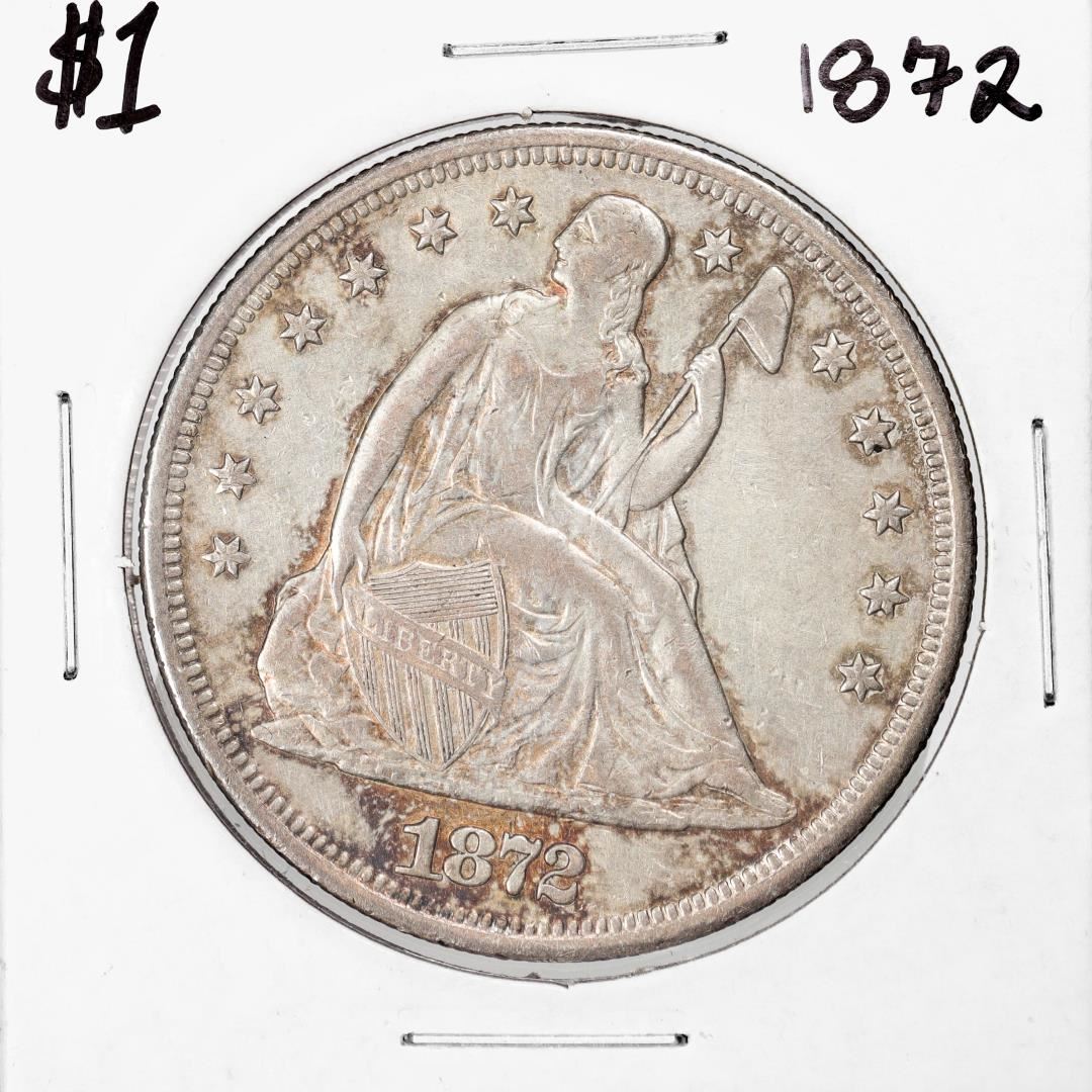 One 1872 $1 Seated Liberty Silver Dollar Coin.