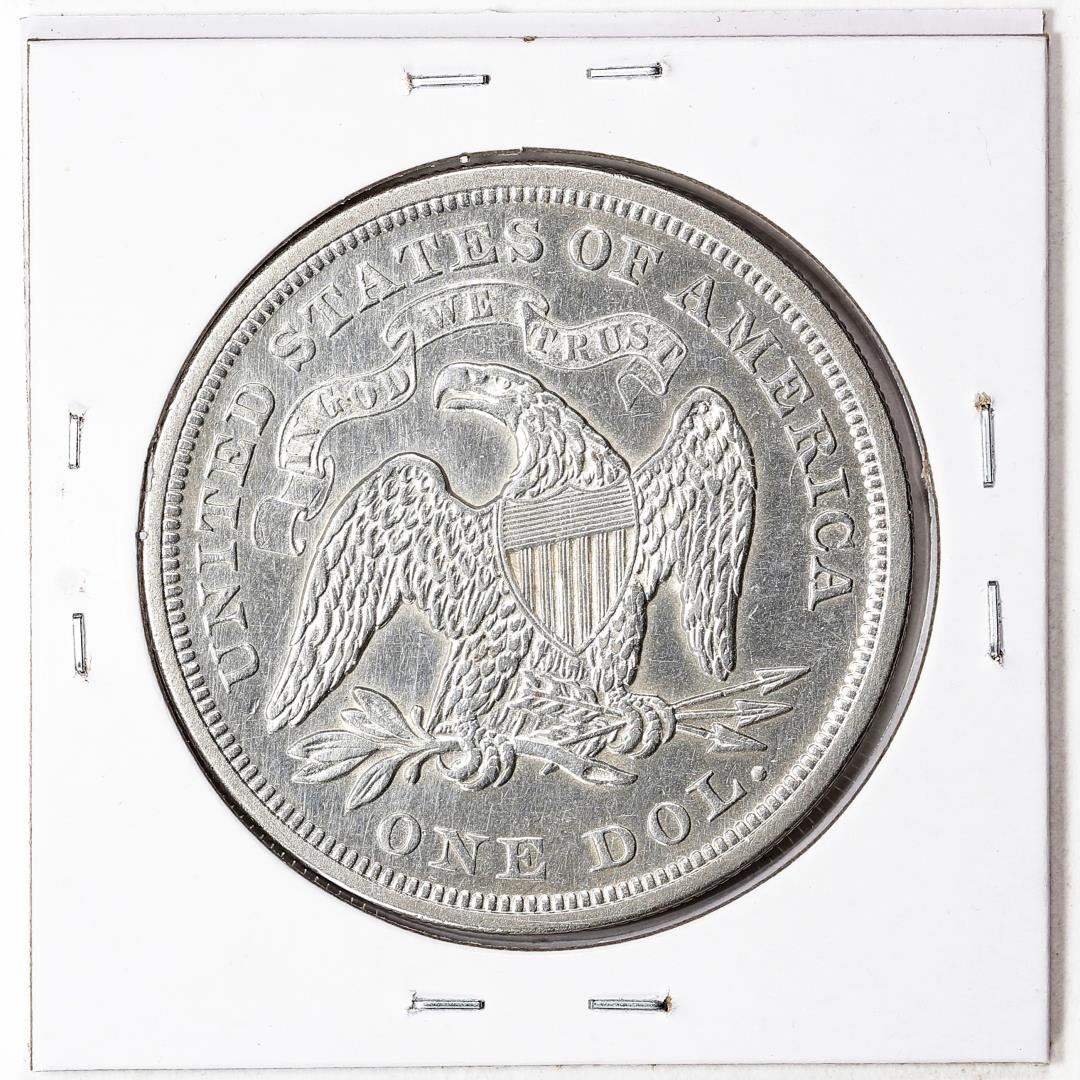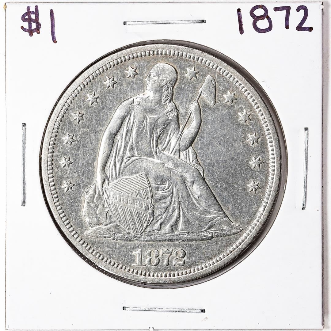 One 1872 $1 Seated Liberty Silver Dollar Coin.