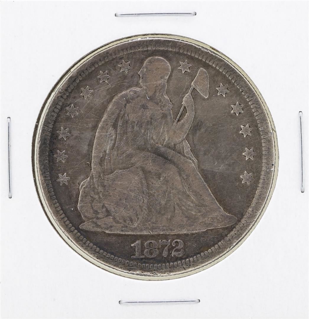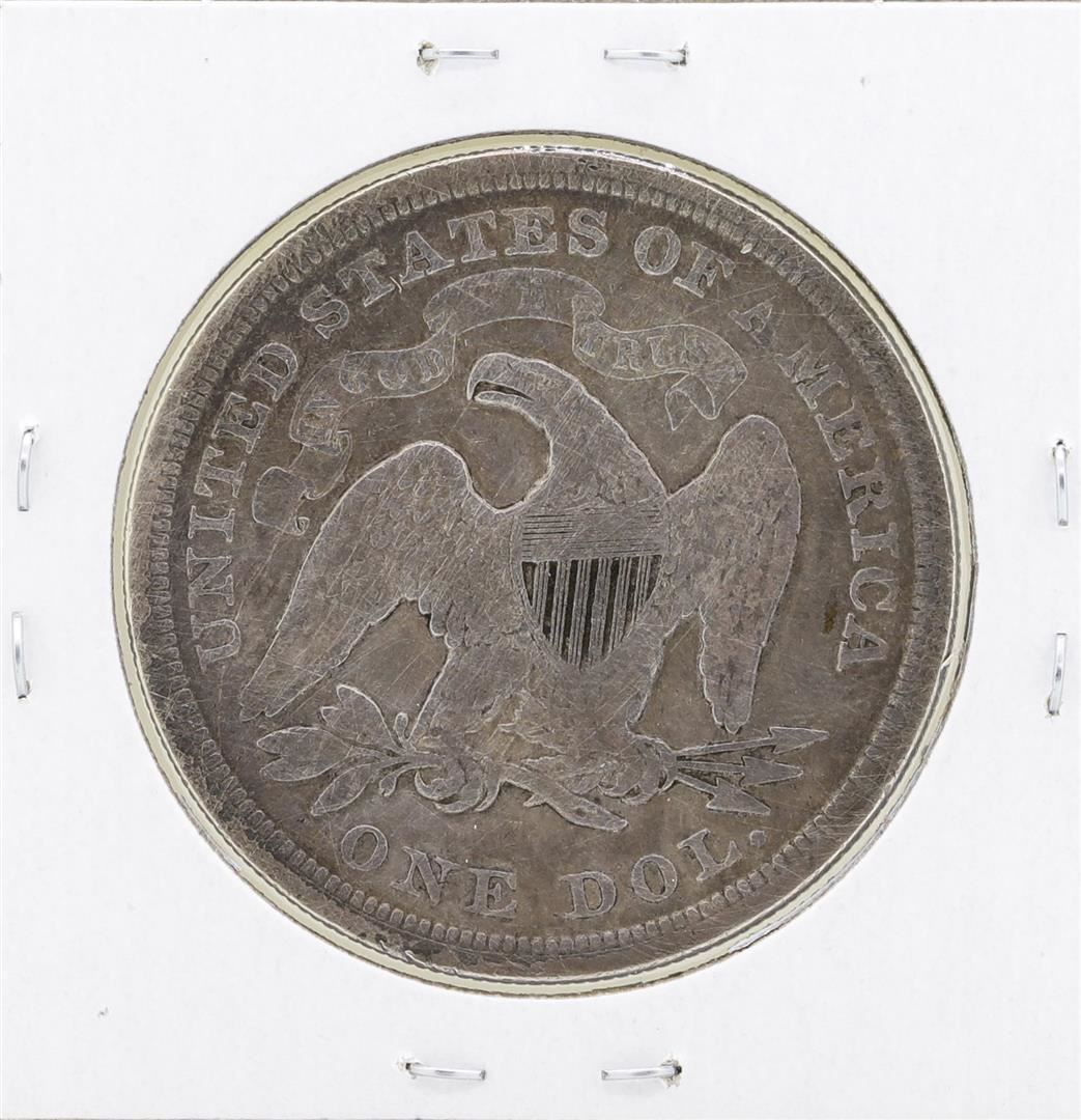 One 1872 $1 Seated Silver Dollar Coin.