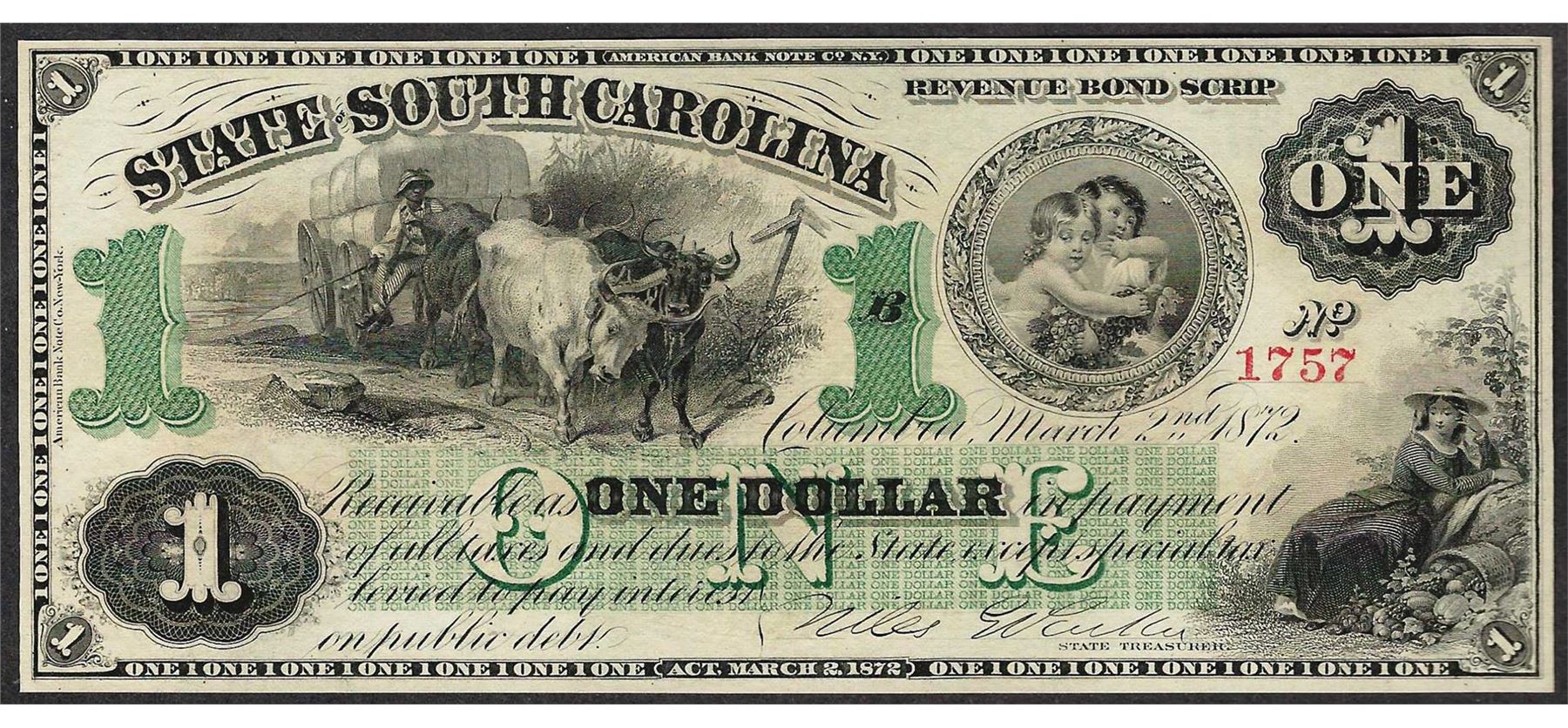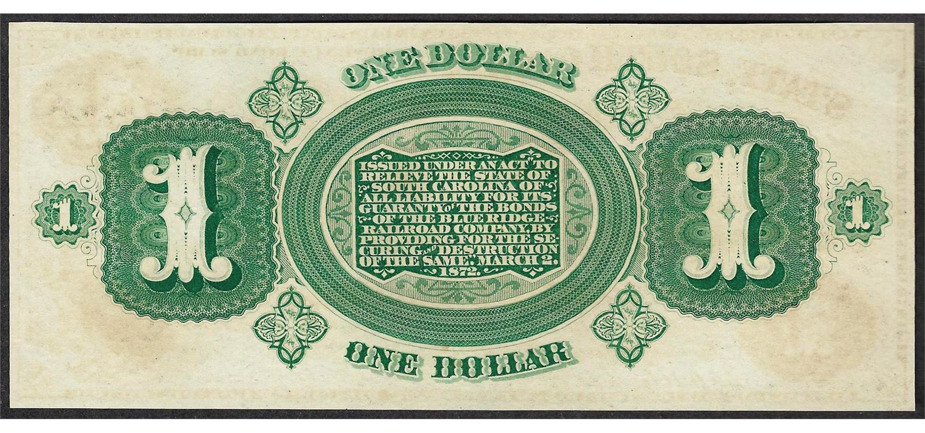 One 1872 $1 State of South Carolina Obsolete Bank Note.