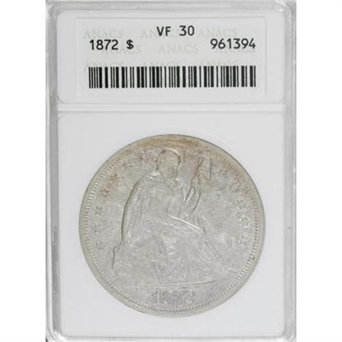 <B>1872 $1 VF30 ANACS.</B></I> NGC Census: (6/249). PCGS Population (14/300). Mintage: 1,106,450. Numismedia Wsl. Price for NGC/PCGS coin in VF30: $315. (#6968)<BR><BR><B>Coin Engraver:</B> Christian Gobrecht<BR><BR><b>Shipping:</b> Coins & Currency (<a target="_blank" href="http://www.heritageauctions.com/common/shipping.php">view shipping information</a>\)