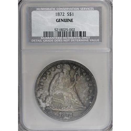 <B>1872 $1 Genuine NCS.</B></I> NGC Census: (0/0). PCGS Population (0/0). Mintage: 1,106,450. Numismedia Wsl. Price for NGC/PCGS coin in NG : $11. (#6968)<BR><BR><B>Coin Engraver:</B> Christian Gobrecht<BR><BR><b>Shipping:</b> Coins & Currency (<a target="_blank" href="http://www.heritageauctions.com/common/shipping.php">view shipping information</a>)