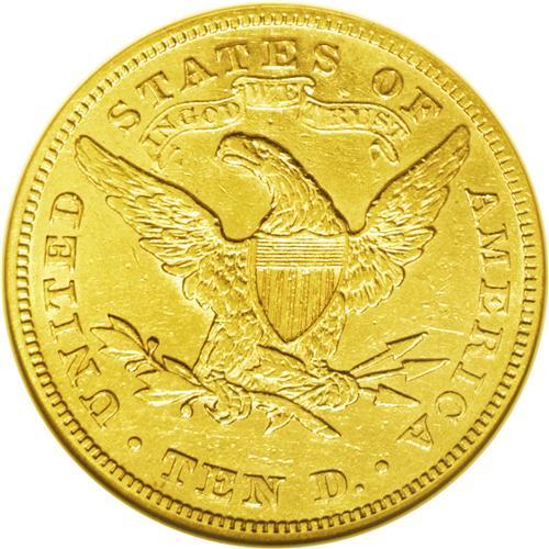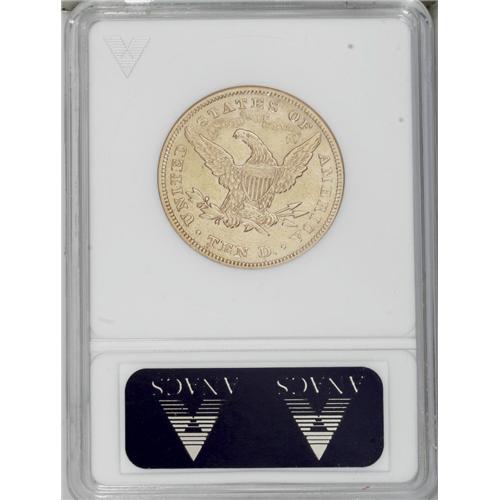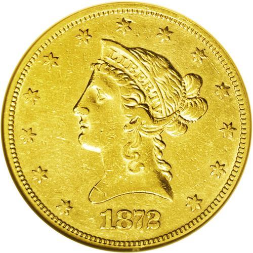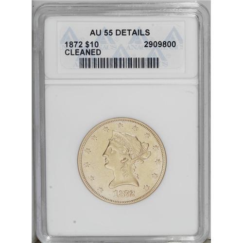 <B>1872<$10>--Cleaned--ANACS. AU55 Details.</B></I> The bright yellow surfaces show only diffused mint luster as a result of cleaning. Myriad light abrasions are seen under a loupe, evidence of light circulation, but there are no major impairments. To quote from the Garrett-Guth gold reference, "The 1872 eagle is a great low-mintage rarity with a well-established reputation in a series that is replete with some of the condition rarities in all of U.S. numismatics." Despite the attempt at improvement, much pleasing detail remains. The strike is decent, with softness noted chiefly on the hair above Liberty's ear and on the fletchings. From a mintage of only 1,620 business strikes.