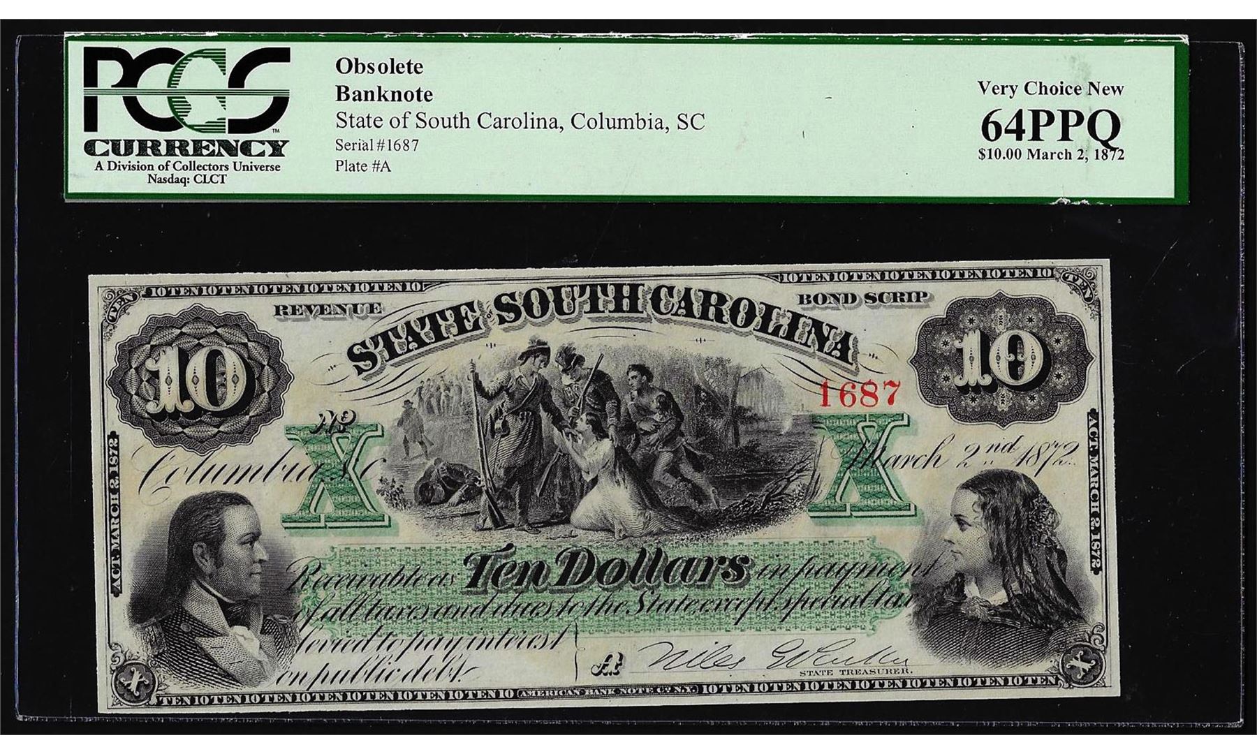One 1872 $10 State of South Carolina Obsolete Note PCGS Very Choice New 64PPQ. PCGS Graded.