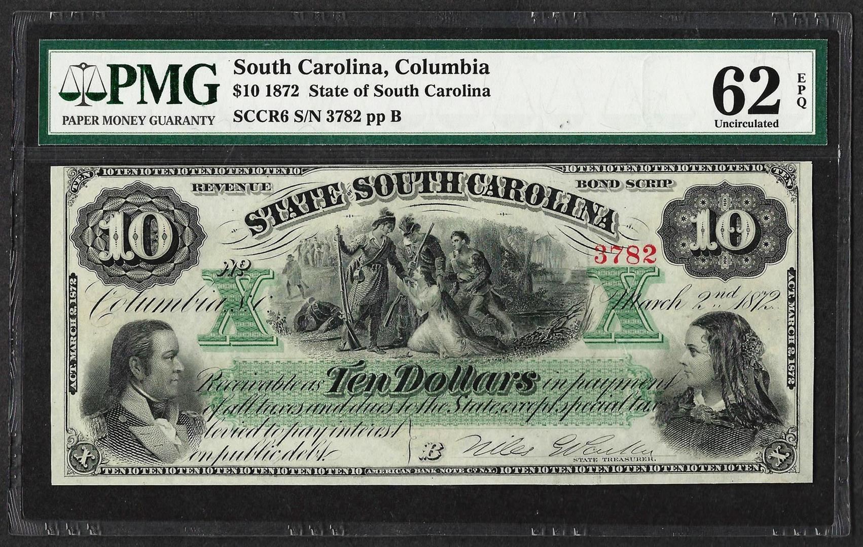 1872 $10 State of South Carolina Obsolete Note PMG Uncirculated 62EPQ