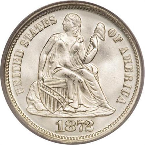<B>1872 10C MS67 PCGS. CAC.</B></I> Fortrin-102. Obverse 2: Triple Punched 2, Misplaced Digits in Gown, Medium Level Date. Reverse B: Die Lines Rim To Wreath At 2:00.<BR>This is a visually stunning coin that is, unsurprisingly, the single finest-graded 1872 Seated dime of any die variety at PCGS, as of (3/08). Intensely frosty with shimmering, snow-white surfaces that do not show even a hint of toning, on either side. The striking details are sharp and crisp throughout, and both the obverse and the reverse exhibit pristine, impeccable preservation. Simply a great coin, with awesome technical quality and wonderful eye appeal. <BR><BR><B>Coin Engraver:</B> Christian Gobrecht<BR><BR><b>Shipping:</b> Coins & Currency (<a target="_blank" href="http://www.heritageauctions.com/common/shipping.php">view shipping information</a>)