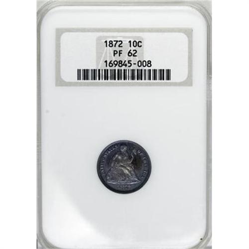 <B>1872 10C PR62 NGC.</B></I> NGC Census: (10/79). PCGS Population (32/100). Mintage: 950. Numismedia Wsl. Price for NGC/PCGS coin in PR62: $308. (#4765)<BR><BR><B>Coin Engraver:</B> Christian Gobrecht<BR><BR><b>Shipping:</b> Coins & Currency (<a target="_blank" href="http://www.heritageauctions.com/common/shipping.php">view shipping information</a>)