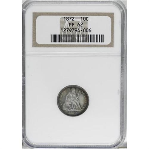 <B>1872 10C PR62 NGC.</B></I> NGC Census: (10/80). PCGS Population (32/101). Mintage: 950. Numismedia Wsl. Price for NGC/PCGS coin in PR62: $325. (#4765)<BR><BR><B>Coin Engraver:</B> Christian Gobrecht<BR><BR><b>Shipping:</b> Coins & Currency (<a target="_blank" href="http://www.heritageauctions.com/common/shipping.php">view shipping information</a>)
