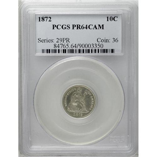 1872 10C PR64 Cameo PCGS. Thin, hazy patina appears on