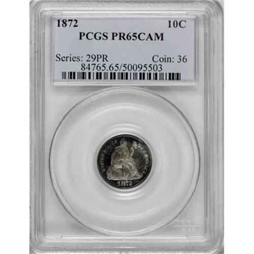 <B>1872 10C PR65 Cameo PCGS.</B></I> Whispers of violet and sea-green patina visit the shining fields of this sharply struck Gem. Gleaming with excellent contrast between the lightly frosted devices and the rest of the surfaces, an enticing Seated proof. Population: 6 in 65 Cameo, 5 finer (10/07).<BR><BR><b>Shipping:</b> Coins & Currency (<a target="_blank" href="http://www.heritageauctions.com/common/shipping.php">view shipping information</a>)