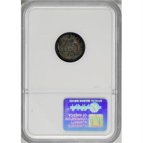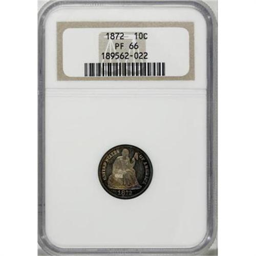 <B>1872 10C PR66 NGC.</B></I> Despite a mintage of 950 pieces, the 1872 proves challenging in Gem and even more so beyond this level. This PR66 representative is predominantly champagne-toned with an arc of blue at the right obverse and a ring of similar patina at the reverse margins. Census: 7 in 66, 3 finer (10/07).<BR><BR><B>Coin Engraver:</B> Christian Gobrecht<BR><BR><b>Shipping:</b> Coins & Currency (<a target="_blank" href="http://www.heritageauctions.com/common/shipping.php">view shipping information</a>)