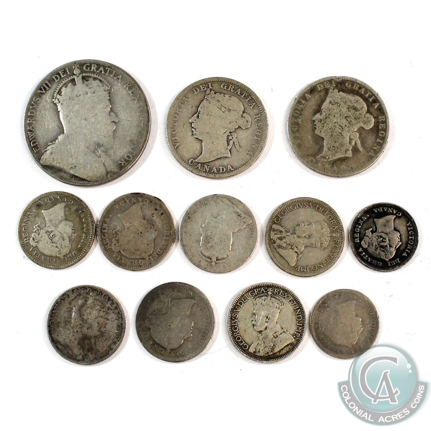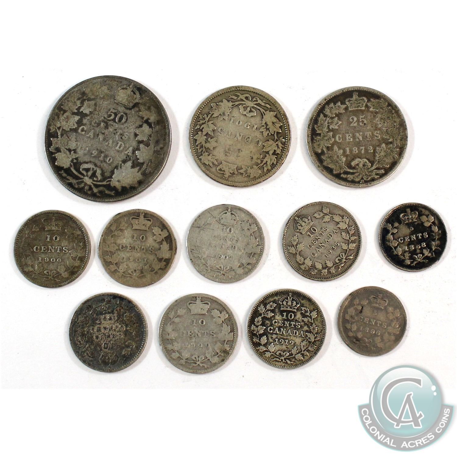 1872-1935 Canada Silver Type Coin Collection. You will receive the following; 1888 & 1896 5-cent, 2x 1900, 1901, 2x 1907, 1919, 1935 10-cent, 1872 & 1901 25-cent, and 1910 50-cent. 12pcs.
