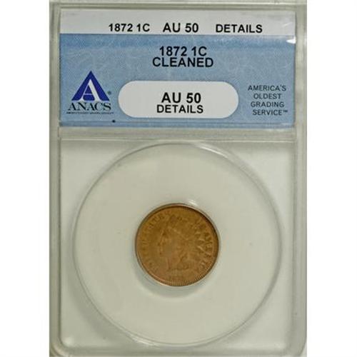 <B>1872 1C --Cleaned--ANACS. AU50 Details.</B></I> NGC Census: (13/225). PCGS Population (30/172). Mintage: 4,042,000. Numismedia Wsl. Price for NGC/PCGS coin in AU50: $515. (#2103)<BR><BR><B>Coin Engraver:</B> James B. Longacre<BR><BR><b>Shipping:</b> Coins & Currency (<a target="_blank" href="http://www.heritageauctions.com/common/shipping.php">view shipping information</a>)