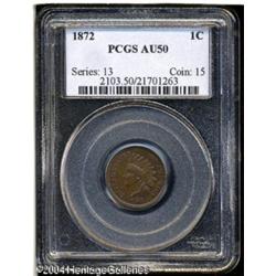 1872 1C AU50 PCGS. Softly struck on the reverse, w <B>1872 1C AU50 PCGS.</B></I> Softly struck on the reverse, with rich charcoal-brown coloration overall, minor wear on the highpoints, and a few tiny nicks on both sides. A lightly circulated example of the second most difficult date of the low-mintage 1870s. <BR><BR><B>Important notice:</B> Heritage usually auctions material at the rate of 200-250 lots per hour. On some occasions eBay Live bid software or the Internet may not be able to keep up with the pace of the auction. We recommend placing a realistic absentee bid now as insurance to avoid disappointment. Occasionally the auctioneer may eliminate or reject an eBay Live bid, and the auctioneer may also reopen a lot after the close of the eBay live bidding (usually because we missed an audience bid), and may reject your bid even if it shows you as the winning bidder. By bidding via eBay Live, you agree that Heritage may award the lot to another bidder at its sole discretion under the circumstances described above or any other reasonable circumstances. Since eBay bids are not shown to us until we open the lot on the floor, we treat those bids just like floor bids. In most cases the floor responds before the eBay bid is presented to us, due to Internet lag time, so for consistency we have made it a policy that floor bids are always considered first over tie eBay live bids. Also please note that all Heritage lots purchased through eBay Live carry a 20% Buyer's Premium. Please make sure you read the Terms and Conditions before you bid. This lot is being auctioned in conjunction with a live floor auction by Heritage Galleries & Auctioneers. All final auction and invoice information will be supplied by Heritage Galleries & Auctioneers, and all other information should be considered preliminary. Lot:5082
