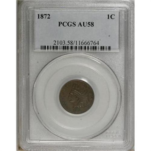 <B>1872 1C AU58 PCGS.</B></I> PCGS Population (35/77). NGC Census: (32/139). Mintage: 4,042,000. Numismedia Wsl. Price for NGC/PCGS coin in AU58: $565. (#2103)<BR><BR><b>Shipping:</b> Coins & Currency (<a target="_blank" href="http://www.heritageauctions.com/common/shipping.php">view shipping information</a>)