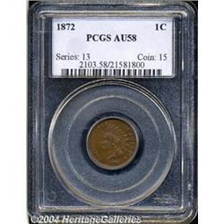 <B>1872<1C> AU58 PCGS.</B></I> Not fully struck on the top of the shield or the sides of the wreath, but this glossy chocolate-brown near-Mint better date Cent possesses pleasing surfaces and exhibits scant evidence of rub. <BR><BR><B>Important notice:</B> Heritage usually auctions material at the rate of 200-250 lots per hour. On some occasions eBay Live bid software or the Internet may not be able to keep up with the pace of the auction. We recommend placing a realistic absentee bid now as insurance to avoid disappointment. Occasionally the auctioneer may eliminate or reject an eBay Live bid, and the auctioneer may also reopen a lot after the close of the eBay live bidding (usually because we missed an audience bid), and may reject your bid even if it shows you as the winning bidder. By bidding via eBay Live, you agree that Heritage may award the lot to another bidder at its sole discretion under the circumstances described above or any other reasonable circumstances. Since eBay bids are not shown to us until we open the lot on the floor, we treat those bids just like floor bids. In most cases the floor responds before the eBay bid is presented to us, due to Internet lag time, so for consistency we have made it a policy that floor bids are always considered first over tie eBay live bids. Also please note that all Heritage lots purchased through eBay Live carry a 20% Buyer's Premium. Please make sure you read the Terms and Conditions before you bid. </span></font></tr></table></td></tr></table>