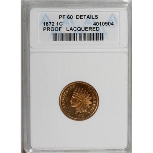 <B>1872 1C --Lacquered--ANACS. PR60 Details.</B></I> NGC Census: (0/44). PCGS Population (0/25). Mintage: 950. (#2303)<BR><BR><B>Coin Engraver:</B> James B. Longacre<BR><BR><b>Shipping:</b> Coins & Currency (<a target="_blank" href="http://www.heritageauctions.com/common/shipping.php">view shipping information</a>)
