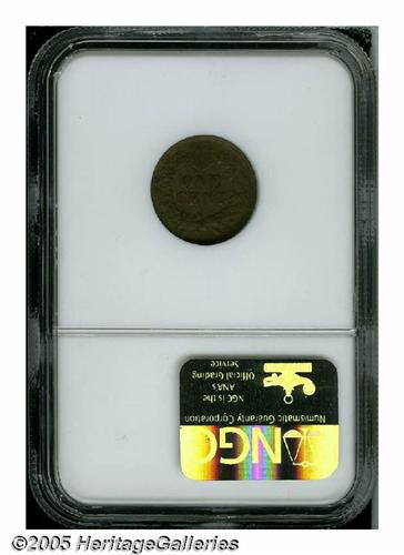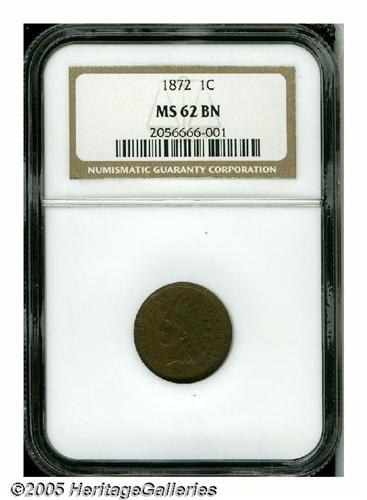 <B>1872<1C> MS62 Brown NGC.</B></I> Well struck except for the lower part of the Oak wreath. A rich coating of tobacco-brown toning, over both sides, obscures the luster of the piece somewhat, thus limiting its grade assessment from NGC.