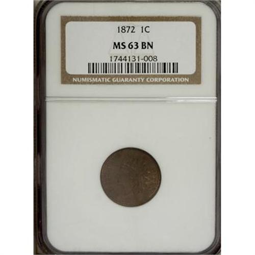 <B>1872 1C MS63 Brown NGC.</B></I> Soft copper-orange, rose, and violet shadings converge on this lovely Select coin. Well struck with only light marks, a pleasing representative of this lower-mintage issue.<BR><BR><B>Coin Engraver:</B> James B. Longacre<BR><BR><b>Shipping:</b> Coins & Currency (<a target="_blank" href="http://www.heritageauctions.com/common/shipping.php">view shipping information</a>)