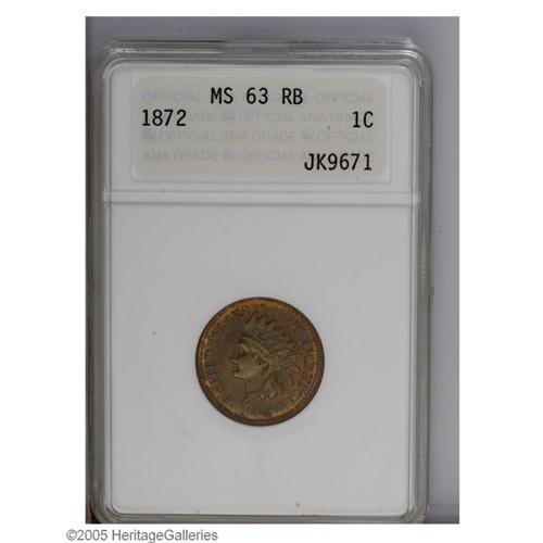 <B>1872<1C> MS63 Red and Brown ANACS.</B></I> Sharply and evenly struck with original mint color still in evidence about the margins and over the reverse center. A strict Mint State example of this second most difficult date in the 1870s.<BR><I>From The Petosky Collection.</B></I>