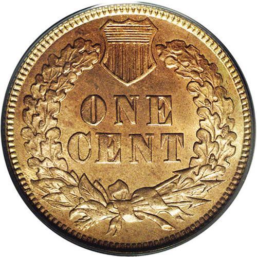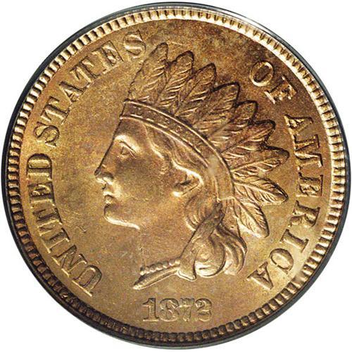 <B>1872<1C> MS64 Red PCGS.</B></I> This scarce semi-key date had a mintage of over 4 million pieces, many of which entered circulation or were melted. Fewer than 80 Mint State coins have been given the Red designation by PCGS or NGC. This specimen displays bright orange luster with speckles of crimson and lime-green. The design elements are sharply struck, including clear definition on all four diamonds. A few minor marks on the Indian's cheek define the grade. Population: 44 in 64 Red, 15 finer (4/06).