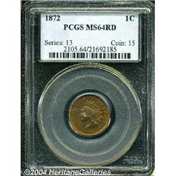 <B>1872<1C> MS64 Red PCGS.</B></I> Although not comparable in overall scarcity to the 1877, this issue is a definite second in regards to Indian Head Cents of the 1870s. Both sides of this near-Gem example boast rich, golden-red color. Some typical weakness is noted at the obverse border and over the reverse. A couple of small abrasions at the base of the obverse do not overly detract. A conditionally scarce example worthy of a close look and a strong bid. Population: 39 in 64, 13 finer (9/04). <BR><BR><B>Important notice:</B> Heritage usually auctions material at the rate of 200-250 lots per hour. On some occasions eBay Live bid software or the Internet may not be able to keep up with the pace of the auction. We recommend placing a realistic absentee bid now as insurance to avoid disappointment. Occasionally the auctioneer may eliminate or reject an eBay Live bid, and the auctioneer may also reopen a lot after the close of the eBay live bidding (usually because we missed an audience bid), and may reject your bid even if it shows you as the winning bidder. By bidding via eBay Live, you agree that Heritage may award the lot to another bidder at its sole discretion under the circumstances described above or any other reasonable circumstances. Since eBay bids are not shown to us until we open the lot on the floor, we treat those bids just like floor bids. In most cases the floor responds before the eBay bid is presented to us, due to Internet lag time, so for consistency we have made it a policy that floor bids are always considered first over tie eBay live bids. Also please note that all Heritage lots purchased through eBay Live carry a 20% Buyer's Premium. Please make sure you read the Terms and Conditions before you bid.