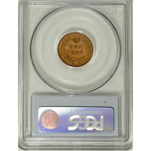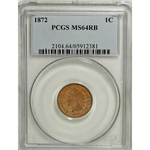 <B>1872 1C MS64 Red and Brown PCGS.</B></I> Bold N in ONE. A well preserved and satiny near-Gem with consistent mellowed red-gold color. A small mint-made strike-through is noted near the base of the ME in AMERICA.<BR><BR><B>Coin Engraver:</B> James B. Longacre<BR><BR><b>Shipping:</b> Coins & Currency (<a target="_blank" href="http://www.heritageauctions.com/common/shipping.php">view shipping information</a>)