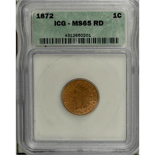 <B>1872 1C MS65 Red ICG.</B></I> This is a full red Gem example of this popular, semi-key issue from the early Indian cent series. Only 4 million pieces were struck, and surprisingly few were set aside. This piece shows full definition on all the design elements, and each side is covered with deep cherry-red mint luster.<I><BR>From The Santa Fe Collection.</B></I><BR><BR><B>Coin Engraver:</B> James B. Longacre<BR><BR><b>Shipping:</b> Coins & Currency (<a target="_blank" href="http://www.heritageauctions.com/common/shipping.php">view shipping information</a>\)