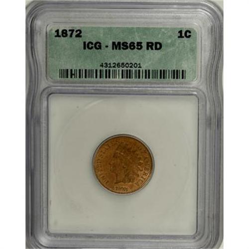 <B>1872 1C MS65 Red ICG.</B></I> This is a full red Gem example of this popular, semi-key issue from the early Indian cent series. Slightly more than 4 million pieces were struck, and surprisingly few were set aside. This piece shows strong definition on all the design elements, and each side is covered with deep cherry-red mint luster. This is the highest grade most collectors can hope to obtain.<I><BR></B></I><BR><BR><B>Coin Engraver:</B> James B. Longacre<BR><BR><b>Shipping:</b> Coins & Currency (<a target="_blank" href="http://www.heritageauctions.com/common/shipping.php">view shipping information</a>)