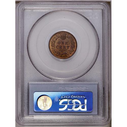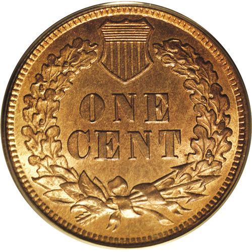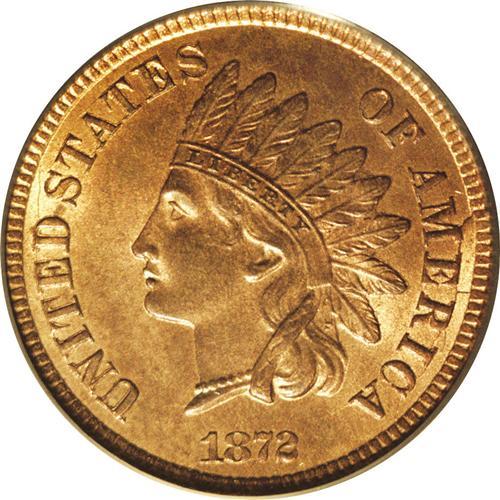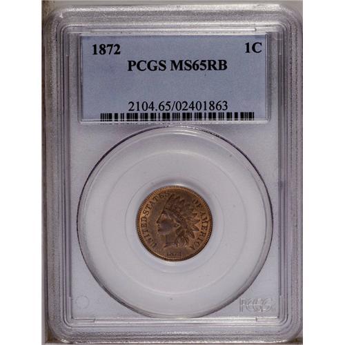 <B>1872<1C> MS65 Red and Brown PCGS.</B></I> The 1872 is a difficult coin to locate with any degree of original luster despite a not insignificant mintage of 4 million pieces. This coin displays a mostly golden-orange appearance, although glossy, blue-brown overtones account for the Red and Brown designation. The obverse is well struck; the reverse is bold over the wreath with a little softness of detail in the center. A frosty textured Gem.