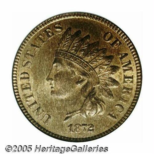 <B>1872<1C> MS65 Red and Brown PCGS.</B></I> The rarity of the 1872 (4 million pieces produced, many of which were probably melted) may not be as well known as, say, that of the 1877. Indian Cent specialists, however, rightly regard the '72 as a key to this long-lived and widely collected series. This is an important Gem with plenty of golden-red luster still in evidence. Actually, there is very little muting of the original color. A slightly soft strike on the reverse limits the grade. Overall smooth in sheen, and solidly graded as a Gem.
