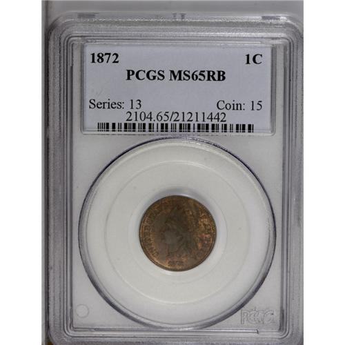 <B>1872<1C> MS65 Red and Brown PCGS.</B></I> This Gem has a colorful, streaky patina that ranges from orange-copper to magenta and chestnut. Well struck with plenty of eye appeal.