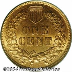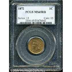 <B>1872<1C> MS65 Red and Brown PCGS.</B></I> The rarity of the 1872 (4 million pieces produced, many of which were probably melted) may not be as well known as, say, that of the 1877. Indian Cent specialists, however, rightly regard the 1872 as a semi-key to this long-lived and widely collected series. This is an important Gem with plenty of orange-red luster still in evidence. A razor sharp strike further enhances the already pleasing eye appeal. Overall smooth in sheen, and solidly graded as a Gem. <BR><BR><B>Important notice:</B> Heritage usually auctions material at the rate of 200-250 lots per hour. On some occasions eBay Live bid software or the Internet may not be able to keep up with the pace of the auction. We recommend placing a realistic absentee bid now as insurance to avoid disappointment. Occasionally the auctioneer may eliminate or reject an eBay Live bid, and the auctioneer may also reopen a lot after the close of the eBay live bidding (usually because we missed an audience bid), and may reject your bid even if it shows you as the winning bidder. By bidding via eBay Live, you agree that Heritage may award the lot to another bidder at its sole discretion under the circumstances described above or any other reasonable circumstances. Since eBay bids are not shown to us until we open the lot on the floor, we treat those bids just like floor bids. In most cases the floor responds before the eBay bid is presented to us, due to Internet lag time, so for consistency we have made it a policy that floor bids are always considered first over tie eBay live bids. Also please note that all Heritage lots purchased through eBay Live carry a 20% Buyer's Premium. Please make sure you read the Terms and Conditions before you bid.